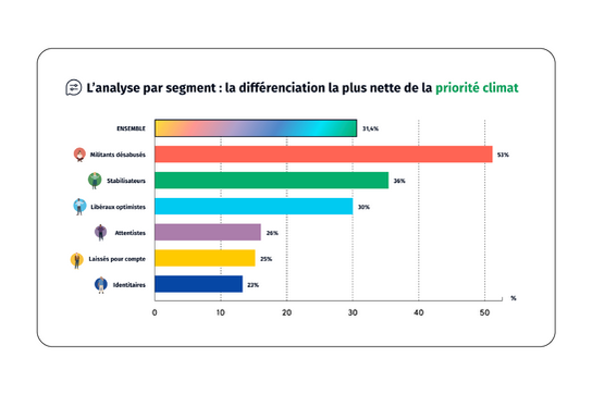 Une étude inédite sur le rapport des Français au climat (base 4000 répondants - 2022) basée sur la segmentation par familles de valeurs de Destin Commun s'attachant à catégoriser 6 groupes homogènes dans leur vision du monde, leurs valeurs et leur positionnement au sein de la société. Une étude qui a permis de comprendre plus finement le rapport au climat de chaque famille.